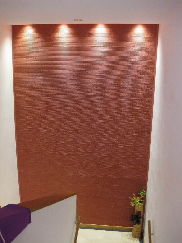 座敷床の間赤壁、階段踊り場赤壁は弁柄しっくい櫛引仕上げを施し、座敷他の赤壁、階段他の壁はじゅらくHR押え(特赤色・ベージュ色)で仕上げました。