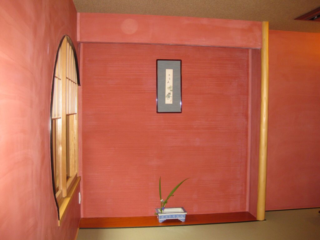 座敷床の間赤壁、階段踊り場赤壁は弁柄しっくい櫛引仕上げを施し、座敷他の赤壁、階段他の壁はじゅらくHR押え(特赤色・ベージュ色)で仕上げました。