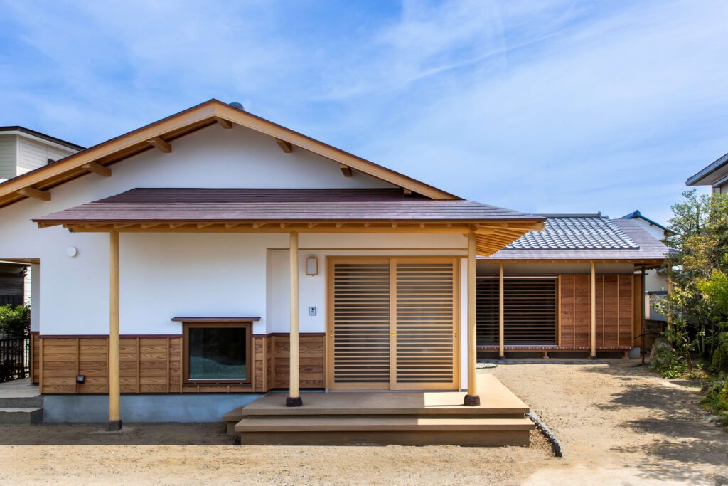 綺麗な水平ラインを意識した銅板による腰葺き和瓦屋根と落ち着きのある数寄屋造りの日本家屋との調和を考え漆喰自体の各素材も厳選し、何度も配合調整を繰り返した自家製漆喰で仕上げました。